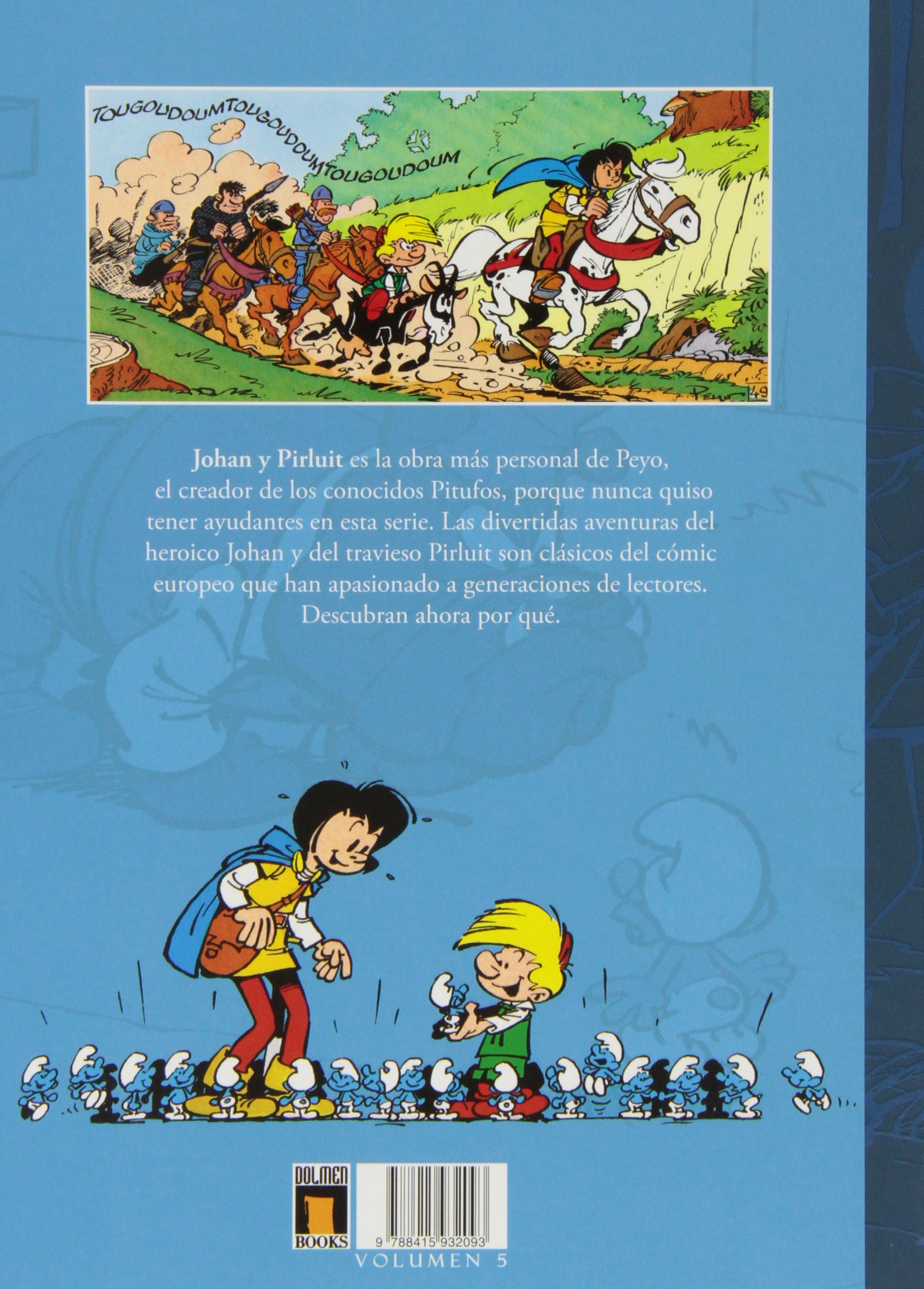 El volumen 5 fue el segundo editado por Dolmen en esta colección de siete integrales. Se publicó de esta manera para conservar el orden cronológico de la edición, pero trayendo primero las historietas más conocidas en España. Los números 1, 2 y 3 vinieron después ya que eran obras editadas hacía muchísimos años o incluso inéditas en nuestro país. Por su parte, los volúmenes 6 y 7 incluyen las historias del equipo que tomó las riendas de la serie tras la muerte de Peyo.